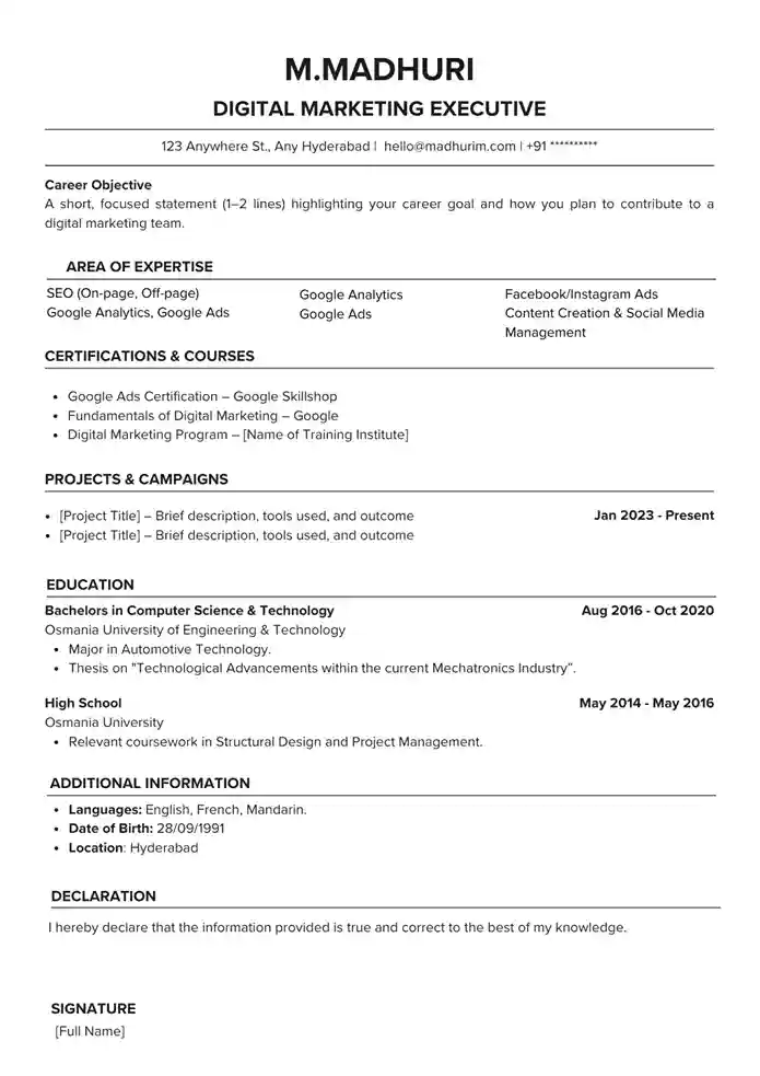 Note: Standard sections like personal details and education can follow the usual resume format. However, make sure the key sections discussed above, such as the objective, skills, certifications, and project experience, convey your digital marketing capabilities clearly.
