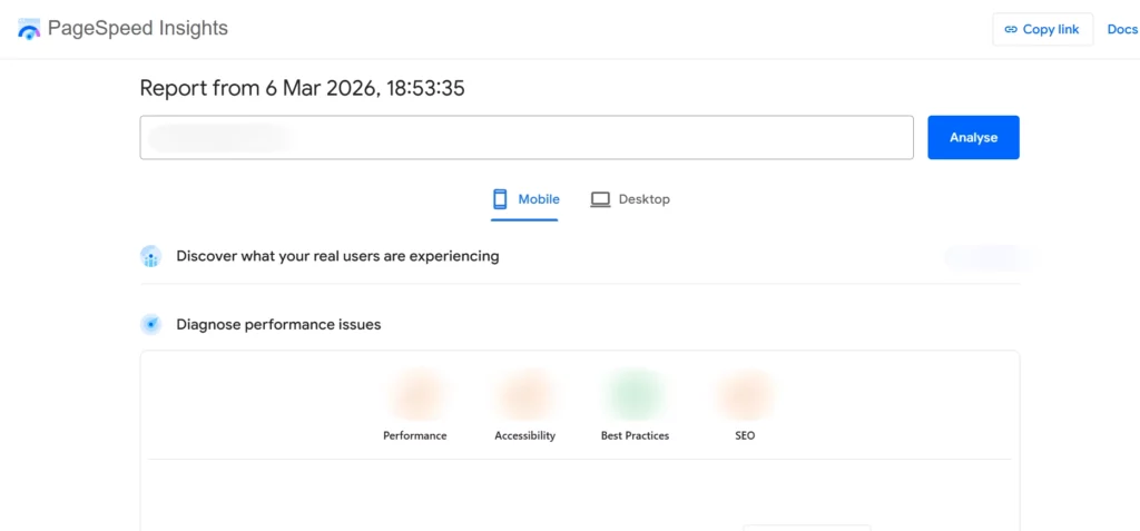 - Core Web Vitals – Shows you how your pages are performing on mobile and desktop and if any page needs to be improved. You can also get page speed insights from this section, which will provide you with detailed metrics of your page’s performance, accessibility, SEO and Best Practices.
